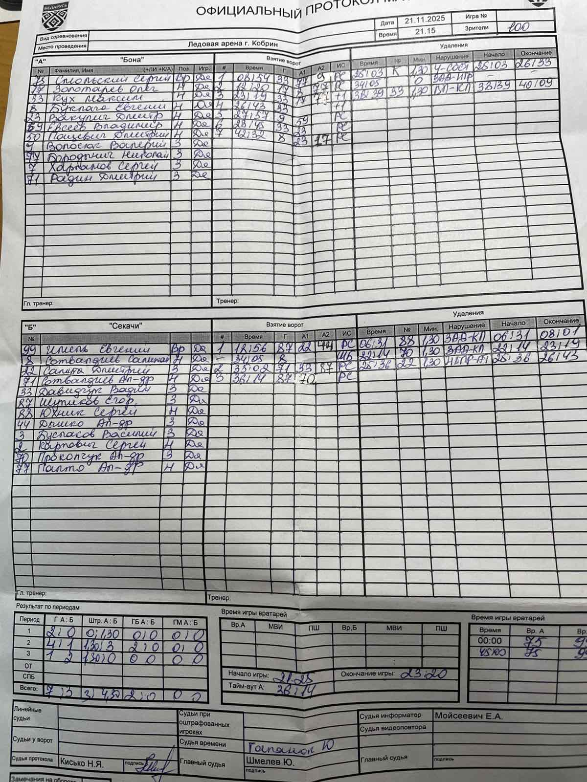 ХК Бона VS ХК Секачи КалендарьТаблица 21-11-2025 21:15 4-й ТУР 17.11-23.11 Кобрин Бона Секачи 73 Обзор Обзор Cтатистика Составы Фото Статистика игроков 06:31 Штрафы Юхник Сергей Кух Максим(Пас: Бородынич Николай, Волосюк Валерий) Гол 08:54 Золотарев Олег(Пас: Буклага Евгений, Бородынич Николай) Гол 12:20 18:56 Гол Шупиков Егор(Пас: Самута Дмитрий, Дышко Александр) 22:14 Штрафы Прокопчук Александр Кух Максим(Пас: Золотарев Олег, Бородынич Николай) Гол 23:19 Волосюк Валерий Штрафы 25:03 25:36 Штрафы Самута Дмитрий Кух Максим Гол 26:43 Волосюк Валерий(Пас: Евсеев Владимир) Гол 27:57 Кух Максим(Пас: Вакулич Дмитрий) Гол 28:45 35:02 Гол Сотвалдиев Александр(Пас: Давидчук Вадим, Самута Дмитрий) 36:14 Гол Шупиков Егор(Пас: Прокопчук Александр) Кух Максим Штрафы 38:39 Буклага Евгений(Пас: Золотарев Олег, Вакулич Дмитрий) Гол 42:42 Смольский Сергей ПШ ПШ Иммель Евгений Пацевич Дмитрий ПШ Бона защитникВремя игры, часПропущено шайбШтрафы Волосюк Валерий2Итого2 нападающийВремя игры, часПропущено шайбШтрафы Кух Максим2Пацевич Дмитрий0.182Итого0.1822 вратарьВремя игры, часКоэффициент надежностиПропущено шайбШтрафы Смольский Сергей0.571.751Итого0.571.751 Секачи защитникВремя игры, часПропущено шайбШтрафы Прокопчук Александр2Самута Дмитрий2Итого4 нападающийВремя игры, часПропущено шайбШтрафы Юхник Сергей2Итого2 вратарьВремя игры, часКоэффициент надежностиПропущено шайбШтрафы Иммель Евгений0.759.337Итого0.759.337 Бона Секачи Стартовые составы Бородынич Николай Буклага Евгений Вакулич Дмитрий Волосюк Валерий Евсеев Владимир Золотарев Олег Кух Максим Пацевич Дмитрий Радин Дмитрий Смольский Сергей Харламов Сергей Буслаков Василий Давидчук Вадим Дышко Александр Иммель Евгений Карпович Сергей Палто Александр Прокопчук Александр Самута Дмитрий Сотвалдиев Александр Сотвалдиев Салижан Шупиков Егор Юхник Сергей