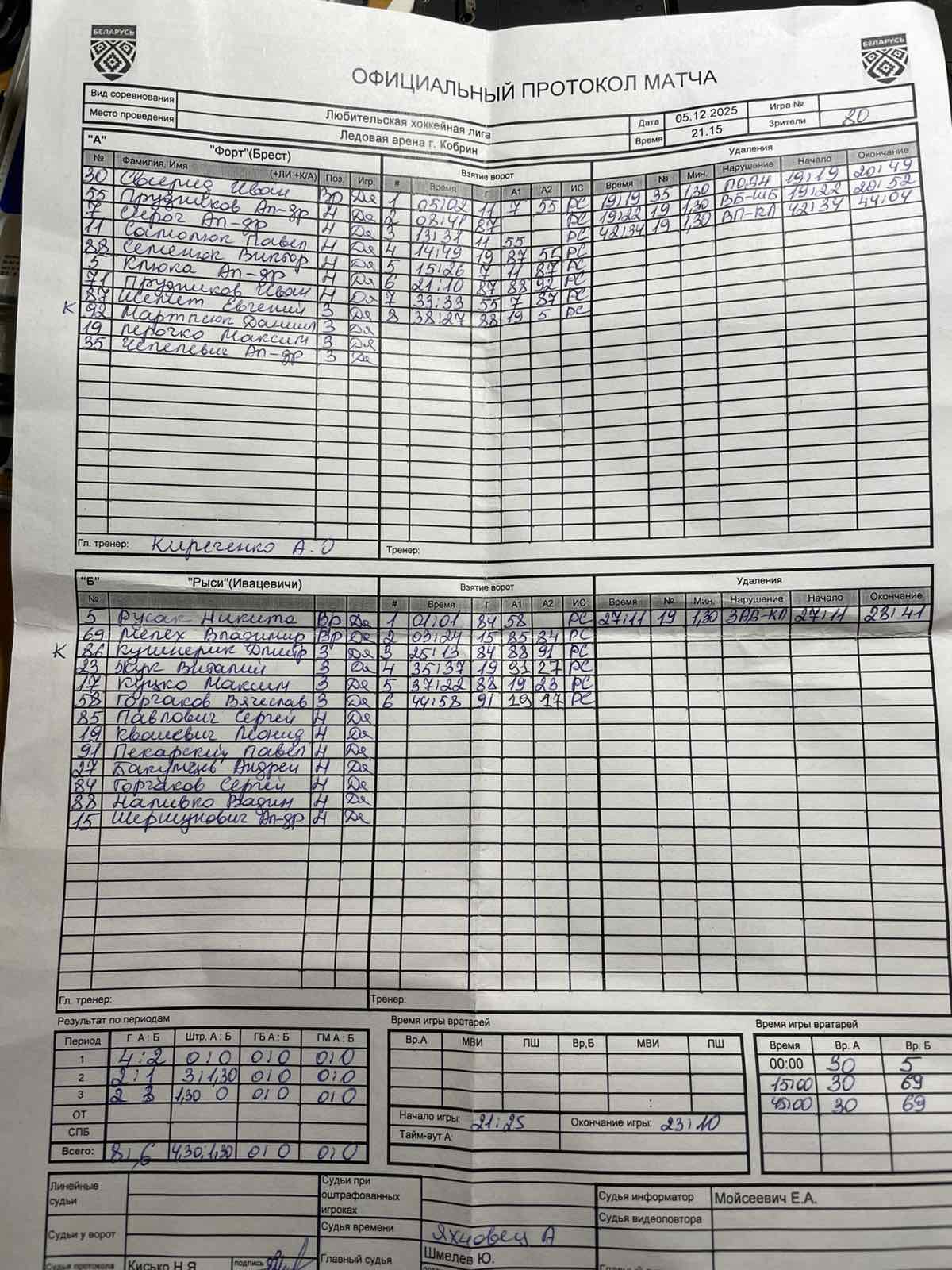 ХК Форт VS ХК Рыси КалендарьТаблица 05-12-2025 21:15 5-й ТУР 01.12-07.12 Кобрин ХК Форт ХК Рыси 86 Обзор Обзор Cтатистика Составы Фото Статистика игроков 01:01 Гол Горчаков Сергей(Пас: Горчаков Вячеслав) 03:24 Гол Шершунович Александр(Пас: Павлович Сергей, Горчаков Сергей) Самолюк Павел(Пас: Прудников Александр, Сироч Александр) Гол 05:02 Шемет Евгений Гол 08:41 Самолюк Павел(Пас: Прудников Александр) Гол 13:31 Мрочко Максим(Пас: Шемет Евгений, Прудников Александр) Гол 14:49 Сироч Александр(Пас: Шемет Евгений, Самолюк Павел) Гол 15:26 Чепелевич Александр Штрафы 19:19 Мрочко Максим Штрафы 19:22 Шемет Евгений(Пас: Семенюк Виктор, Мартысюк Даниил) Гол 21:10 25:13 Гол Горчаков Сергей(Пас: Наливко Вадим, Пекарский Павел) 27:11 Штрафы Квашевич Леонид Прудников Александр(Пас: Сироч Александр, Шемет Евгений) Гол 33:33 35:37 Гол Квашевич Леонид(Пас: Пекарский Павел, Бакумцев Андрей) 37:22 Гол Наливко Вадим(Пас: Квашевич Леонид, Жук Виталий) Семенюк Виктор(Пас: Мрочко Максим, Клюка Александр) Гол 38:27 Мрочко Максим Штрафы 42:34 44:58 Гол Пекарский Павел(Пас: Куцко Максим, Квашевич Леонид) ПШ Русак Никита ПШ Мелех Владимир Свирид Иван ПШ ХК Форт защитникВремя игры, часПропущено шайбШтрафы Мрочко Максим4Чепелевич Александр2Итого6 вратарьВремя игры, часКоэффициент надежностиПропущено шайбШтрафы Свирид Иван0.7586Итого0.7586 ХК Рыси нападающийВремя игры, часПропущено шайбШтрафы Квашевич Леонид2Итого2 вратарьВремя игры, часКоэффициент надежностиПропущено шайбШтрафы Мелех Владимир0.584Русак Никита0.25164Итого0.7510.678 ХК Форт ХК Рыси Стартовые составы Клюка Александр Мартысюк Даниил Мрочко Максим Прудников Александр Прудников Иван Самолюк Павел Свирид Иван Семенюк Виктор Сироч Александр Чепелевич Александр Шемет Евгений Бакумцев Андрей Горчаков Вячеслав Горчаков Сергей Жук Виталий Квашевич Леонид Куцко Максим Кушнерик Дмитрий Мелех Владимир Наливко Вадим Павлович Сергей Пекарский Павел Русак Никита Шершунович Александр