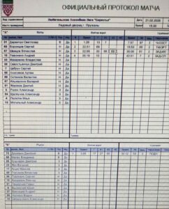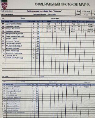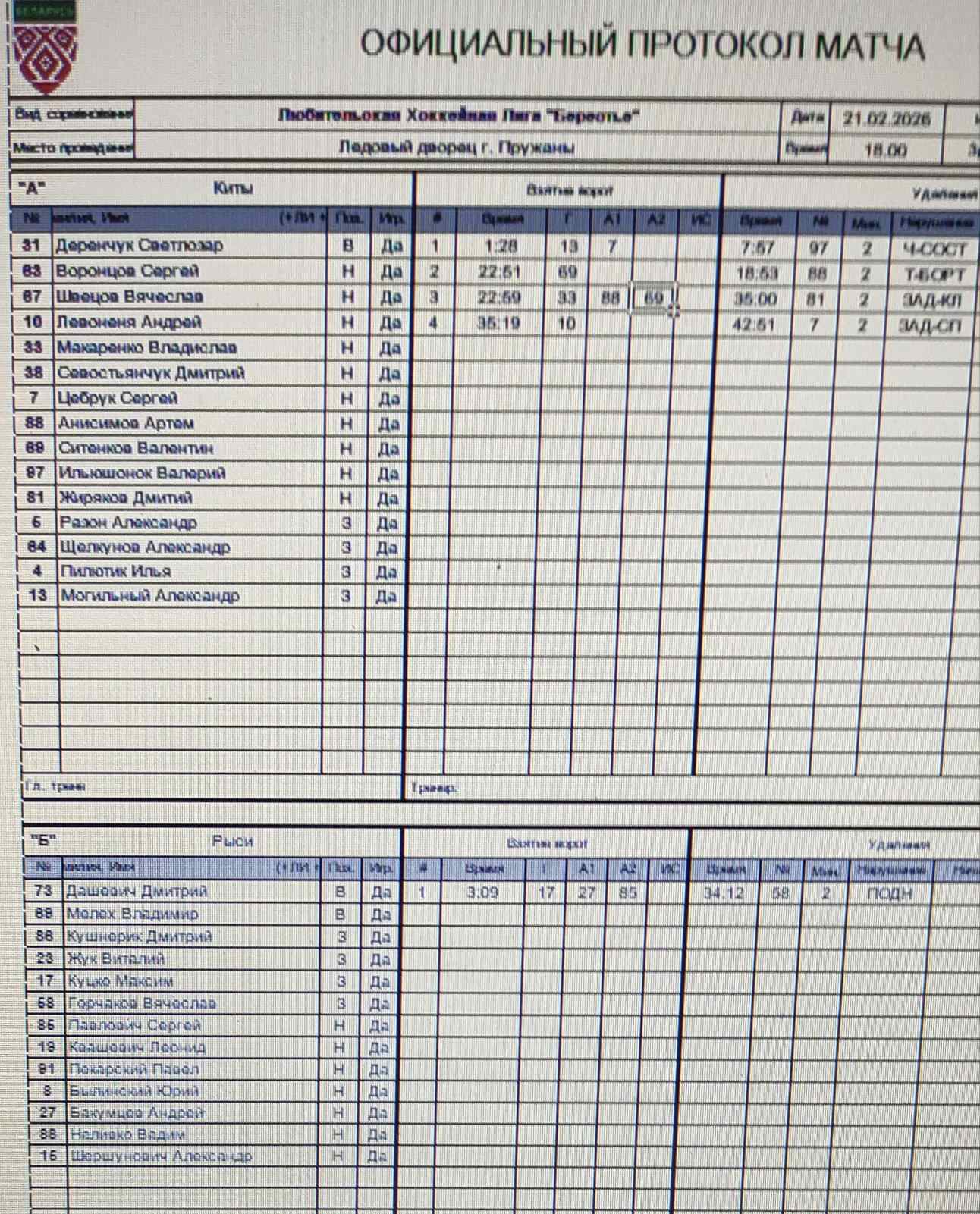 ХК Киты VS ХК Рыси КалендарьТаблица 22-02-2026 16:00 13-й тур Пружаны ХК Киты ХК Рыси 41 Обзор Обзор Cтатистика Составы Фото Статистика игроков Могильный Александр(Пас: Цебрук Сергей) Гол 01:26 03:09 Гол Куцко Максим(Пас: Бакумцев Андрей, Павлович Сергей) Ильюшонок Валерий Штрафы 07:57 Анисимов Артём Штрафы 18:53 Ситенков Валентин Гол 22:51 Макаренко Владислав(Пас: Ситенков Валентин, Анисимов Артём) Гол 22:59 34:12 Штрафы Горчаков Вячеслав Жиряков Дмитрий Штрафы 35:00 Левоненя Андрей Гол 35:19 Цебрук Сергей Штрафы 42:51 ПШ Дашевич Дмитрий Деренчук Светлозар ПШ ХК Киты защитникВремя игры, часПропущено шайбШтрафы Цебрук Сергей2Итого2 нападающийВремя игры, часПропущено шайбШтрафы Анисимов Артём2Жиряков Дмитрий2Ильюшонок Валерий2Итого6 вратарьВремя игры, часКоэффициент надежностиПропущено шайбШтрафы Деренчук Светлозар0.751.331Итого0.751.331 ХК Рыси защитникВремя игры, часПропущено шайбШтрафы Горчаков Вячеслав2Итого2 вратарьВремя игры, часКоэффициент надежностиПропущено шайбШтрафы Дашевич Дмитрий0.755.334Итого0.755.334 ХК Киты ХК Рыси Стартовые составы Анисимов Артём Воронцов Сергей Деренчук Светлозар Жиряков Дмитрий Ильюшонок Валерий Левоненя Андрей Макаренко Владислав Могильный Александр Пилютик Илья Разон Александр Севостьянчук Дмитрий Ситенков Валентин Цебрук Сергей Швецов Вячеслав Щелкунов Александр Бакумцев Андрей Былинский Юрий Горчаков Вячеслав Дашевич Дмитрий Жук Виталий Квашевич Леонид Куцко Максим Кушнерик Дмитрий Мелех Владимир Наливко Вадим Павлович Сергей Пекарский Павел Шершунович Александр