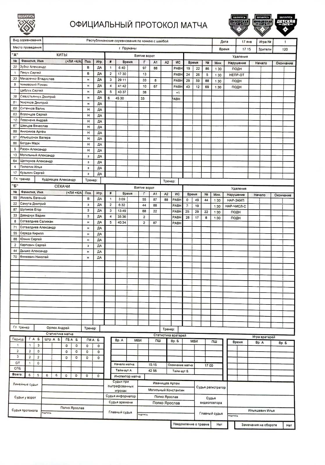 ХК Киты VS ХК Секачи КалендарьТаблица 17-01-2026 18:00 9-й тур Пружаны ХК Киты ХК Секачи 65 Обзор Обзор Cтатистика Составы Фото Статистика игроков 00:49 Штрафы Дышко Александр 03:09 Гол Шупиков Егор(Пас: Юхник Сергей, Середа Кирилл) 06:32 Гол Дышко Александр(Пас: Юхник Сергей, Самута Дмитрий) Ильюшонок Валерий(Пас: Анисимов Артём) Гол 06:40 07:19 Штрафы Сотвалдиев Салижан 13:49 Гол Юхник Сергей(Пас: Самута Дмитрий) Могильный Александр Гол 17:30 Богдан Марк Штрафы 19:22 Разон Александр Штрафы 24:26 25:29 Штрафы Самута Дмитрий 28:17 Штрафы Сотвалдиев Салижан Макаренко Владислав(Пас: Чижевский Роман) Гол 29:11 Анисимов Артём Штрафы 29:59 35:36 Гол Карпович Сергей 40:34 Гол Сотвалдиев Салижан(Пас: Шупиков Егор, Карпович Сергей) Левоненя Андрей(Пас: Швецов Вячеслав) Гол 41:42 Севостьянчук Дмитрий Гол 43:37 Макаренко Владислав Гол 45:30 Ситенков Валентин Штрафы 43:12 ПШ Иммель Евгений Зубко Александр ПШ ХК Киты защитникВремя игры, часПропущено шайбШтрафы Разон Александр2Итого2 нападающийВремя игры, часПропущено шайбШтрафы Анисимов Артём2Богдан Марк2Ситенков Валентин2Итого6 вратарьВремя игры, часКоэффициент надежностиПропущено шайбШтрафы Зубко Александр0.776.495Итого0.776.495 ХК Секачи защитникВремя игры, часПропущено шайбШтрафы Самута Дмитрий2Итого2 нападающийВремя игры, часПропущено шайбШтрафы Дышко Александр2Сотвалдиев Салижан2Итого4 вратарьВремя игры, часКоэффициент надежностиПропущено шайбШтрафы Иммель Евгений0.777.796Итого0.777.796 ХК Киты ХК Секачи Стартовые составы Анисимов Артём Богдан Марк Воронцов Сергей Жиряков Дмитрий Зубко Александр Ильюшонок Валерий Кузмич Сергей Левоненя Андрей Макаренко Владислав Могильный Александр Пекун Сергей Пилютик Илья Разон Александр Севостьянчук Дмитрий Ситенков Валентин Цебрук Сергей Чижевский Роман Швецов Вячеслав Давидчук Вадим Дышко Александр Иммель Евгений Медведь Евгений Самута Дмитрий Середа Кирилл Сотвалдиев Александр Сотвалдиев Салижан Финкевич Николай Шупиков Егор Юхник Сергей