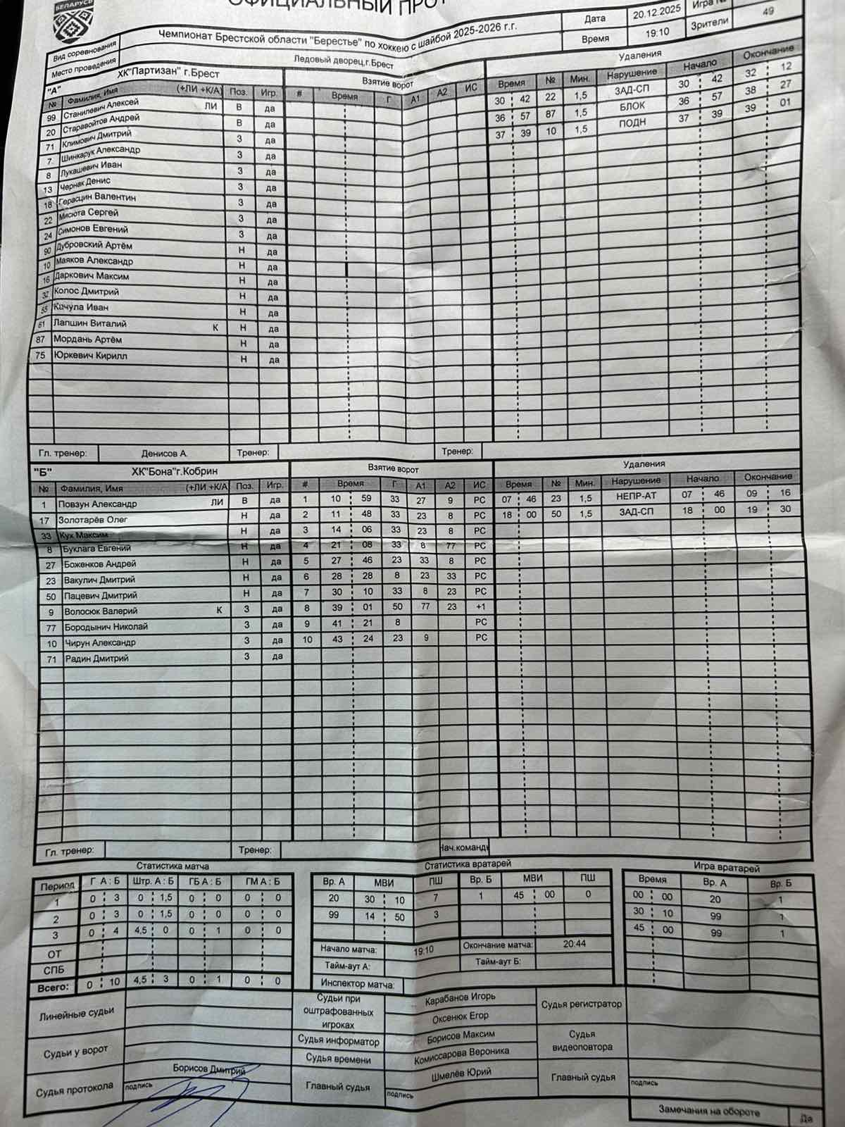 ХК Партизан VS ХК Бона КалендарьТаблица 20-12-2025 19:00 6-й ТУР 15.12-21.12 Брест ХК Партизан ХК Бона 010 Обзор Обзор Cтатистика Составы Фото Статистика игроков 07:46 Штрафы Вакулич Дмитрий 10:59 Гол Кух Максим(Пас: Боженков Андрей, Волосюк Валерий) 11:48 Гол Кух Максим(Пас: Вакулич Дмитрий, Буклага Евгений) 14:06 Гол Кух Максим(Пас: Вакулич Дмитрий, Буклага Евгений) 18:00 Штрафы Пацевич Дмитрий 21:08 Гол Кух Максим(Пас: Буклага Евгений, Бородынич Николай) 27:46 Гол Вакулич Дмитрий(Пас: Кух Максим, Буклага Евгений) 28:28 Гол Буклага Евгений(Пас: Вакулич Дмитрий, Кух Максим) 30:10 Гол Кух Максим(Пас: Буклага Евгений, Вакулич Дмитрий) Мисюта Сергей Штрафы 30:42 Мордань Артем Штрафы 36:57 Маяков Александр Штрафы 37:39 39:01 Гол Пацевич Дмитрий(Пас: Бородынич Николай, Вакулич Дмитрий) 41:21 Гол Буклага Евгений 43:24 Гол Вакулич Дмитрий(Пас: Волосюк Валерий) Старовойтов Андрей ПШ Станилевич Алексей ПШ ПШ Повзун Александр ХК Партизан защитникВремя игры, часПропущено шайбШтрафы Мисюта Сергей2Итого2 нападающийВремя игры, часПропущено шайбШтрафы Маяков Александр2Мордань Артем2Итого4 вратарьВремя игры, часКоэффициент надежностиПропущено шайбШтрафы Станилевич Алексей0.25164Старовойтов Андрей0.5126Итого0.7513.3310 ХК Бона нападающийВремя игры, часПропущено шайбШтрафы Вакулич Дмитрий2Пацевич Дмитрий2Итого4 вратарьВремя игры, часКоэффициент надежностиПропущено шайбШтрафы Повзун Александр0.7500Итого0.7500 ХК Партизан ХК Бона Стартовые составы Герасцин Валентин Даркович Максим Дубровский Артем Качула Иван Климович Дмитрий Колос Дмитрий Лапшин Виталий Лукашевич Иван Маяков Александр Мисюта Сергей Мордань Артем Симонов Евгений Станилевич Алексей Старовойтов Андрей Чернак Денис Шинкарук Александр Юркевич Кирилл Боженков Андрей Бородынич Николай Буклага Евгений Вакулич Дмитрий Волосюк Валерий Золотарев Олег Кух Максим Пацевич Дмитрий Повзун Александр Радин Дмитрий Харламов Сергей Чирун Александр