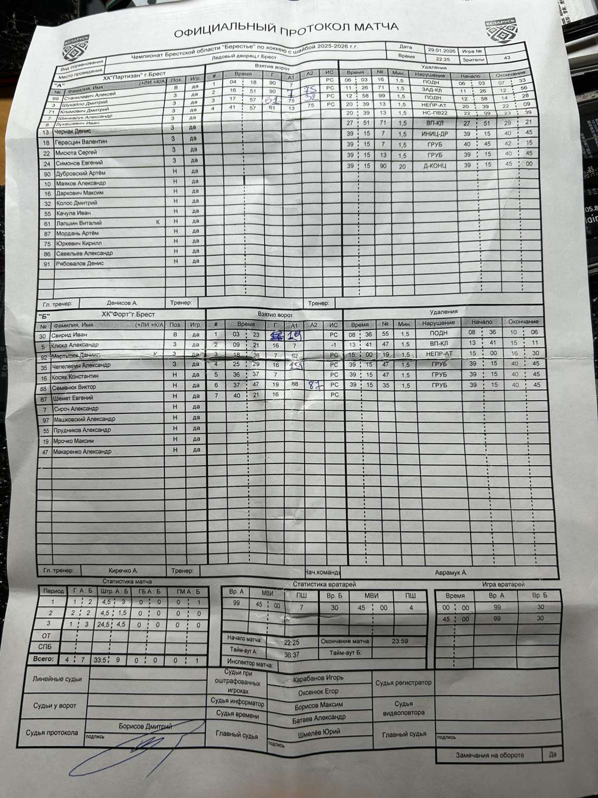 ХК Партизан VS ХК Форт КалендарьТаблица 29-01-2026 22:15 10-й тур Брест ХК Партизан ХК Форт 47 Обзор Обзор Cтатистика Составы Фото Статистика игроков 03:23 Гол Мрочко Максим Дубровский Артем(Пас: Шинкарук Александр) Гол 04:18 Даркович Максим Штрафы 06:03 06:36 Штрафы Прудников Александр 09:21 Гол Косяк Константин(Пас: Сироч Александр) Климович Дмитрий Штрафы 11:26 Станилевич Алексей Штрафы 12:58 13:41 Штрафы Макаренко Александр 15:00 Штрафы Мрочко Максим Дубровский Артем(Пас: Шинкарук Александр, Юркевич Кирилл) Гол 16:51 Лапшин Виталий(Пас: Юркевич Кирилл, Колос Дмитрий) Гол 17:57 18:36 Гол Сироч Александр(Пас: Мартысюк Даниил) Чернак Денис Штрафы 20:39 Чернак Денис Штрафы 20:39 25:29 Гол Косяк Константин(Пас: Мрочко Максим) Климович Дмитрий Штрафы 27:51 36:37 Гол Сироч Александр 37:47 Гол Мрочко Максим(Пас: Шемет Евгений, Семенюк Виктор) Шинкарук Александр Штрафы 39:15 Шинкарук Александр Штрафы 39:15 Чернак Денис Штрафы 39:15 Дубровский Артем Штрафы 39:15 39:15 Штрафы Макаренко Александр 39:15 Штрафы Макаренко Александр 39:15 Штрафы Чепелевич Александр 40:21 Гол Косяк Константин Лапшин Виталий(Пас: Чернак Денис, Юркевич Кирилл) Гол 41:57 ПШ Свирид Иван Станилевич Алексей ПШ ХК Партизан защитникВремя игры, часПропущено шайбШтрафы Климович Дмитрий4Чернак Денис6Шинкарук Александр4Итого14 нападающийВремя игры, часПропущено шайбШтрафы Даркович Максим2Дубровский Артем20Итого22 вратарьВремя игры, часКоэффициент надежностиПропущено шайбШтрафы Станилевич Алексей0.759.3372Итого0.759.3372 ХК Форт защитникВремя игры, часПропущено шайбШтрафы Мрочко Максим2Чепелевич Александр2Итого4 нападающийВремя игры, часПропущено шайбШтрафы Макаренко Александр6Прудников Александр2Итого8 вратарьВремя игры, часКоэффициент надежностиПропущено шайбШтрафы Свирид Иван0.755.334Итого0.755.334 ХК Партизан ХК Форт Стартовые составы Герасцин Валентин Даркович Максим Дубровский Артем Качула Иван Климович Дмитрий Колос Дмитрий Лапшин Виталий Лукашевич Иван Маяков Александр Мисюта Сергей Мордань Артем Рябовалов Денис Савельев Александр Симонов Евгений Станилевич Алексей Чернак Денис Шинкарук Александр Шукайло Дмитрий Юркевич Кирилл Клюка Александр Косяк Константин Макаренко Александр Мартысюк Даниил Машковский Александр Мрочко Максим Прудников Александр Свирид Иван Семенюк Виктор Сироч Александр Чепелевич Александр Шемет Евгений