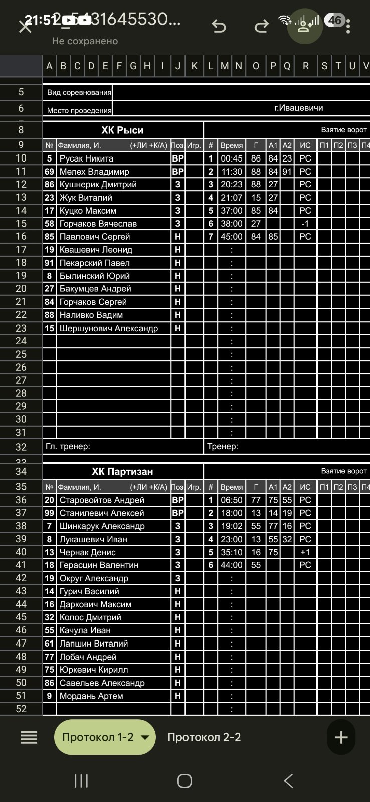ХК Рыси VS ХК Партизан КалендарьТаблица 18-01-2026 16:00 9-й тур Ивацевичи ХК Рыси ХК Партизан 76 Обзор Обзор Cтатистика Составы Фото Статистика игроков Кушнерик Дмитрий(Пас: Горчаков Сергей, Жук Виталий) Гол 00:45 06:50 Гол Лобач Андрей(Пас: Юркевич Кирилл, Качула Иван) Наливко Вадим(Пас: Горчаков Сергей, Пекарский Павел) Гол 11:30 18:00 Гол Чернак Денис(Пас: Гурич Василий, Округ Александр) 19:02 Гол Качула Иван(Пас: Даркович Максим, Лобач Андрей) Наливко Вадим(Пас: Бакумцев Андрей) Гол 20:23 Шершунович Александр(Пас: Бакумцев Андрей) Гол 21:07 23:00 Гол Чернак Денис(Пас: Качула Иван, Колос Дмитрий) Павлович Сергей(Пас: Горчаков Сергей) Гол 37:00 Бакумцев Андрей Гол 38:00 Горчаков Сергей(Пас: Павлович Сергей) Гол 45:16 35:10 Гол Даркович Максим(Пас: Юркевич Кирилл) 44:00 Гол Качула Иван ПШ Старовойтов Андрей Русак Никита ПШ ХК Рыси вратарьВремя игры, часКоэффициент надежностиПропущено шайбШтрафы Русак Никита0.767.896Итого0.767.896 ХК Партизан вратарьВремя игры, часКоэффициент надежностиПропущено шайбШтрафы Старовойтов Андрей0.769.217Итого0.769.217 ХК Рыси ХК Партизан Стартовые составы Бакумцев Андрей Былинский Юрий Горчаков Вячеслав Горчаков Сергей Жук Виталий Квашевич Леонид Куцко Максим Кушнерик Дмитрий Мелех Владимир Наливко Вадим Павлович Сергей Пекарский Павел Русак Никита Шершунович Александр Герасцин Валентин Гурич Василий Даркович Максим Качула Иван Колос Дмитрий Лапшин Виталий Лобач Андрей Лукашевич Иван Мордань Артем Округ Александр Савельев Александр Станилевич Алексей Старовойтов Андрей Чернак Денис Шинкарук Александр Юркевич Кирилл