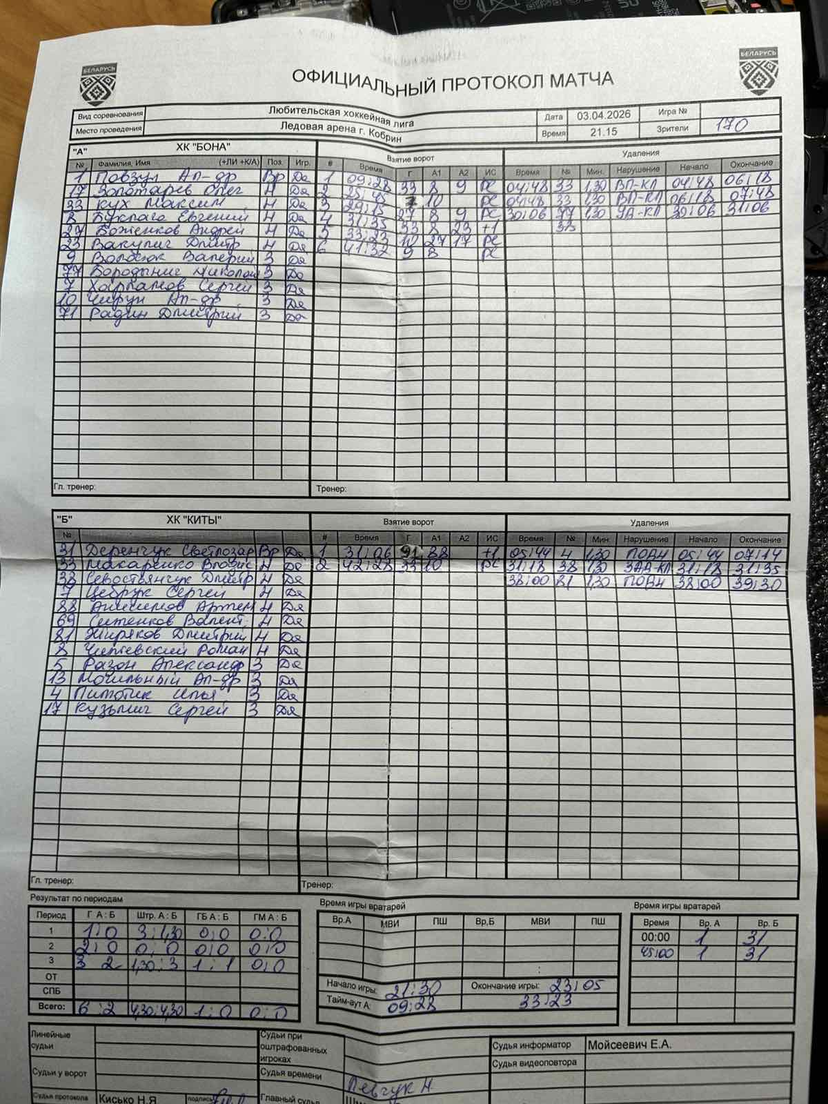 ХК Бона VS ХК Киты КалендарьТаблица 03-04-2025 21:15 Play Off 2025/2026 Кобрин ХК Бона ХК Киты 62 Обзор Обзор Cтатистика Составы Фото Статистика игроков Кух Максим Штрафы 04:48 Кух Максим Штрафы 04:48 05:04 Штрафы Пилютик Илья Кух Максим(Пас: Буклага Евгений, Волосюк Валерий) Гол 09:28 Харламов Сергей(Пас: Чирун Александр) Гол 25:45 Боженков Андрей(Пас: Волосюк Валерий, Буклага Евгений) Гол 29:15 Бородынич Николай Штрафы 30:06 31:18 Штрафы Севостьянчук Дмитрий Кух Максим(Пас: Буклага Евгений, Вакулич Дмитрий) Гол 31:35 Чирун Александр(Пас: Боженков Андрей, Золотарев Олег) Гол 33:23 38:00 Штрафы Жиряков Дмитрий Волосюк Валерий(Пас: Буклага Евгений) Гол 41:32 31:06 Гол Жиряков Дмитрий(Пас: Анисимов Артём) 42:28 Гол Макаренко Владислав(Пас: Могильный Александр) Повзун Александр ПШ ПШ Деренчук Светлозар ХК Бона защитникВремя игры, часПропущено шайбШтрафы Бородынич Николай2Итого2 нападающийВремя игры, часПропущено шайбШтрафы Кух Максим4Итого4 вратарьВремя игры, часКоэффициент надежностиПропущено шайбШтрафы Повзун Александр0.752.672Итого0.752.672 ХК Киты нападающийВремя игры, часПропущено шайбШтрафы Жиряков Дмитрий2Пилютик Илья2Севостьянчук Дмитрий2Итого6 вратарьВремя игры, часКоэффициент надежностиПропущено шайбШтрафы Деренчук Светлозар0.7586Итого0.7586 ХК Бона ХК Киты Стартовые составы Боженков Андрей Бородынич Николай Буклага Евгений Вакулич Дмитрий Волосюк Валерий Золотарев Олег Кух Максим Повзун Александр Радин Дмитрий Харламов Сергей Чирун Александр Анисимов Артём Деренчук Светлозар Жиряков Дмитрий Кузмич Сергей Макаренко Владислав Могильный Александр Пилютик Илья Разон Александр Севостьянчук Дмитрий Ситенков Валентин Цебрук Сергей
