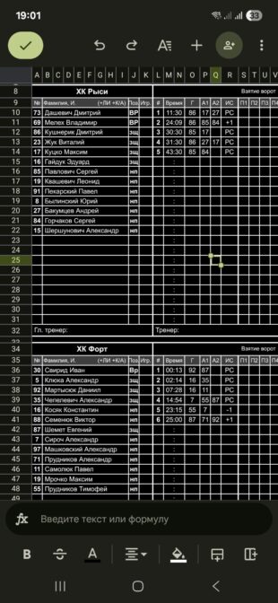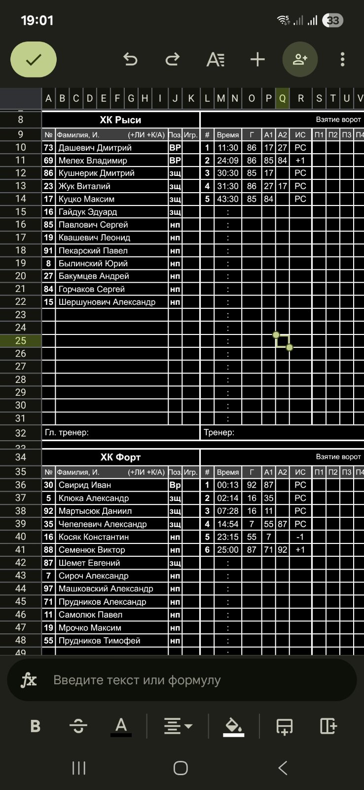 ХК Форт VS ХК Рыси КалендарьТаблица 27-03-2025 20:00 Play Off 2025/2026 Ивацевичи Форт Рыси 65 Обзор Обзор Cтатистика Составы Фото Статистика игроков Мартысюк Даниил(Пас: Шемет Евгений) Гол 00:13 Косяк Константин(Пас: Чепелевич Александр) Гол 02:14 Косяк Константин(Пас: Самолюк Павел) Гол 07:28 11:30 Гол Кушнерик Дмитрий(Пас: Бакумцев Андрей, Куцко Максим) Сироч Александр(Пас: Прудников Тимофей, Шемет Евгений) Гол 14:54 Прудников Тимофей(Пас: Сироч Александр) Гол 23:15 24:09 Гол Кушнерик Дмитрий(Пас: Горчаков Сергей, Павлович Сергей) Шемет Евгений(Пас: Прудников Александр, Мартысюк Даниил) Гол 25:00 30:30 Гол Павлович Сергей(Пас: Куцко Максим) 31:30 Гол Кушнерик Дмитрий(Пас: Куцко Максим, Бакумцев Андрей) 43:30 Гол Павлович Сергей(Пас: Горчаков Сергей) Свирид Иван ПШ ПШ Дашевич Дмитрий Форт вратарьВремя игры, часКоэффициент надежностиПропущено шайбШтрафы Свирид Иван0.756.675Итого0.756.675 Рыси вратарьВремя игры, часКоэффициент надежностиПропущено шайбШтрафы Дашевич Дмитрий0.7586Итого0.7586 Форт Рыси Стартовые составы Клюка Александр Косяк Константин Мартысюк Даниил Машковский Александр Мрочко Максим Прудников Александр Прудников Тимофей Самолюк Павел Свирид Иван Семенюк Виктор Сироч Александр Чепелевич Александр Шемет Евгений Бакумцев Андрей Былинский Юрий Гайдук Эдуард Горчаков Сергей Дашевич Дмитрий Жук Виталий Квашевич Леонид Куцко Максим Кушнерик Дмитрий Павлович Сергей Пекарский Павел Шершунович Александр Замены Мелех Владимир