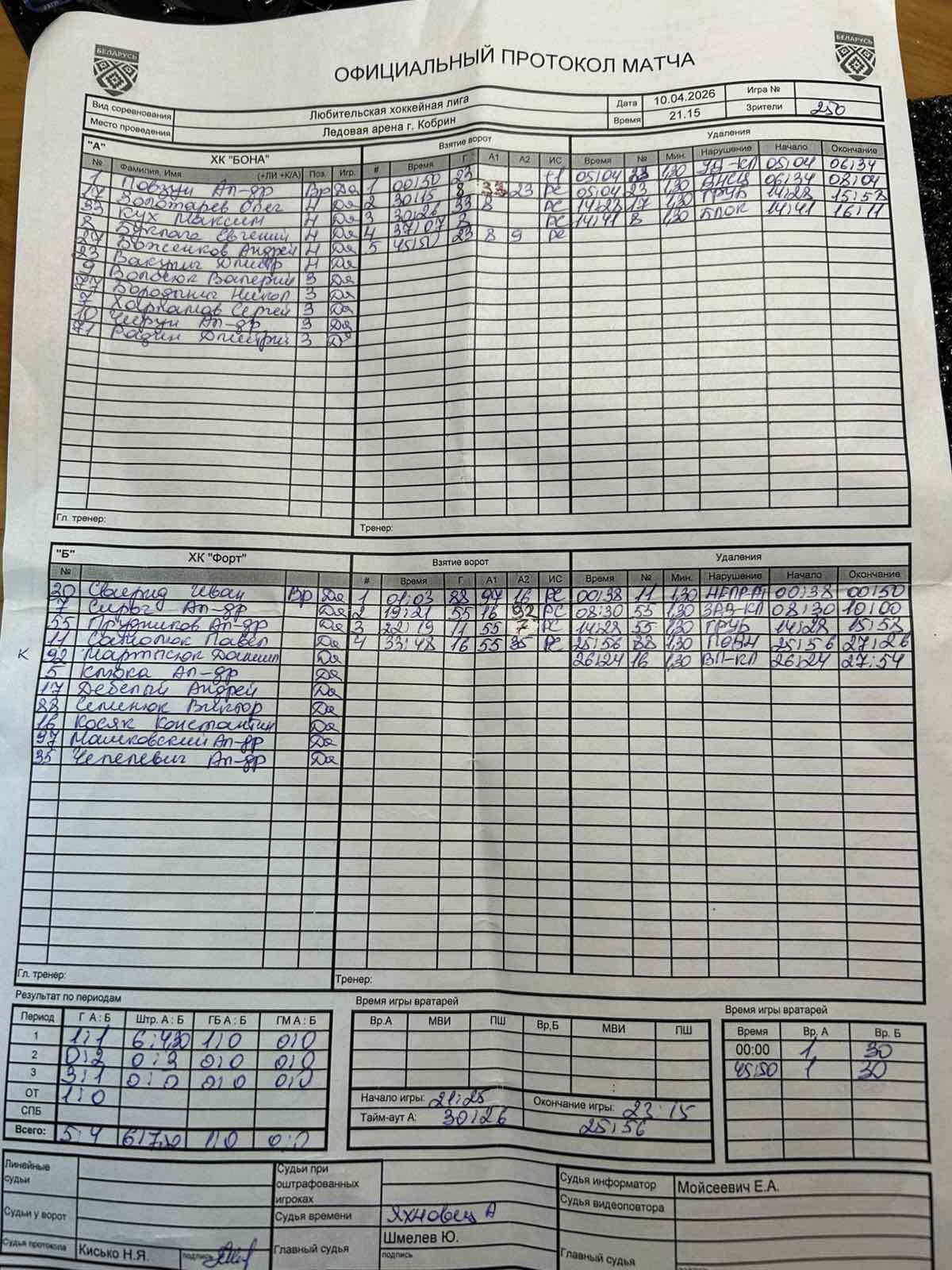ХК Бона VS ХК Форт КалендарьТаблица 10-04-2026 21:15 Play Off 2025/2026 Кобрин ХК Бона ХК Форт 54 Обзор Обзор Cтатистика Составы Фото Статистика игроков 00:38 Штрафы Самолюк Павел Вакулич Дмитрий Гол 00:50 01:03 Гол Семенюк Виктор(Пас: Машковский Александр, Косяк Константин) Вакулич Дмитрий Штрафы 05:04 Вакулич Дмитрий Штрафы 05:04 08:30 Штрафы Прудников Александр Золотарев Олег Штрафы 14:28 14:28 Штрафы Прудников Александр Буклага Евгений Штрафы 14:41 19:21 Гол Прудников Александр(Пас: Косяк Константин, Мартысюк Даниил) 22:19 Гол Самолюк Павел(Пас: Прудников Александр, Сироч Александр) 25:56 Штрафы Семенюк Виктор 26:24 Штрафы Косяк Константин Буклага Евгений(Пас: Кух Максим, Вакулич Дмитрий) Гол 30:15 Кух Максим(Пас: Буклага Евгений) Гол 30:21 Буклага Евгений Гол 37:07 Вакулич Дмитрий(Пас: Буклага Евгений, Волосюк Валерий) Гол 45:50 33:48 Гол Косяк Константин(Пас: Прудников Александр, Чепелевич Александр) Повзун Александр ПШ ПШ Свирид Иван ХК Бона нападающийВремя игры, часПропущено шайбШтрафы Буклага Евгений2Вакулич Дмитрий4Золотарев Олег2Итого8 вратарьВремя игры, часКоэффициент надежностиПропущено шайбШтрафы Повзун Александр0.775.194Итого0.775.194 ХК Форт нападающийВремя игры, часПропущено шайбШтрафы Косяк Константин2Прудников Александр4Самолюк Павел2Семенюк Виктор2Итого10 вратарьВремя игры, часКоэффициент надежностиПропущено шайбШтрафы Свирид Иван0.776.495Итого0.776.495 ХК Бона ХК Форт Стартовые составы Боженков Андрей Бородынич Николай Буклага Евгений Вакулич Дмитрий Волосюк Валерий Золотарев Олег Кух Максим Повзун Александр Радин Дмитрий Харламов Сергей Чирун Александр Дебёлый Андрей Клюка Александр Косяк Константин Мартысюк Даниил Машковский Александр Прудников Александр Самолюк Павел Свирид Иван Семенюк Виктор Сироч Александр Чепелевич Александр